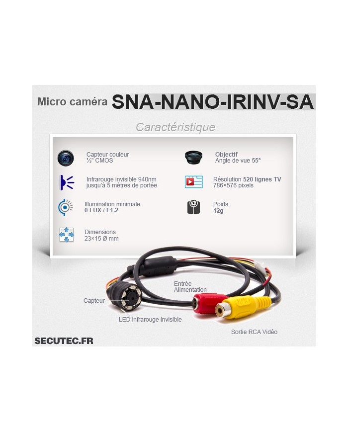 Conçue autour d'un capteur CMOS 1/3" 520 lignes TV avec un angle de vue de 55°, la nano caméra SNA-NANO-IRINV vous permettra de filmer avec une résolution de 786×576 pixels.